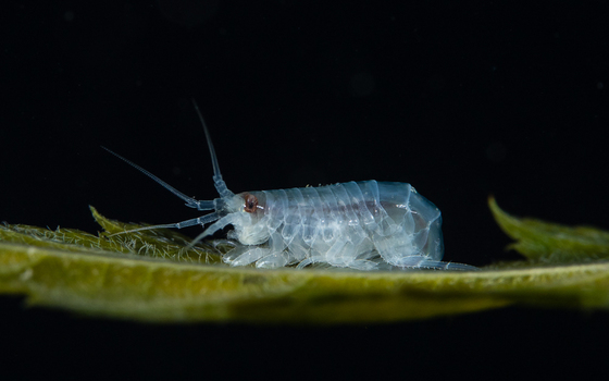 When you peer out into the dark at night underwater, sometimes a surprise floats by. This amphipod was surfing on a leaf in the current.