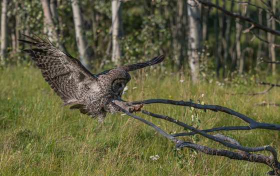 The Great Gray Owl stretches out for the landing at it's next hunting perch.