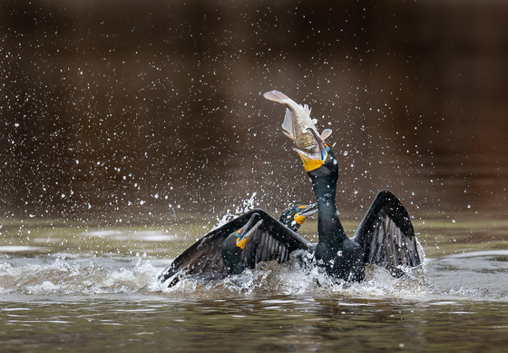 A group of cormorants are fishing for meal in Burlington inner harbour. Suddenly, one of them gets a big fish and other are trying to steal the fish. Resulting in a big fight in the water.