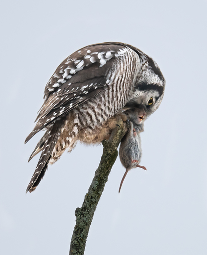 A northern hawk owl is getting a vole from the forest area in Schomberg. It lands on a branch with its prey, preparing to consume it.