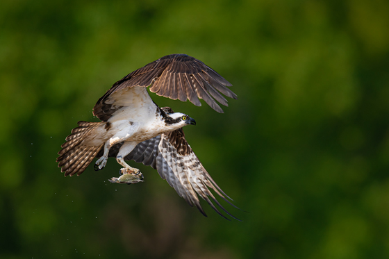An osprey gets a fish from a pond in Burlington. Instead of heading to a tree to consume it, it flies around the pond for a minute or so first. It seems showing off it catch to me.