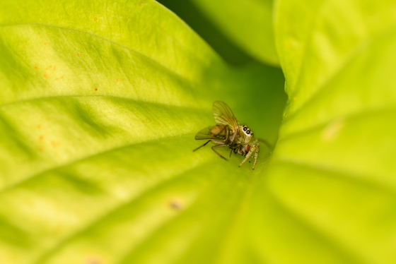 A jumping spider retreats into the leaf of a Hosta so it can devour the fly that it just caught without being eaten itself.