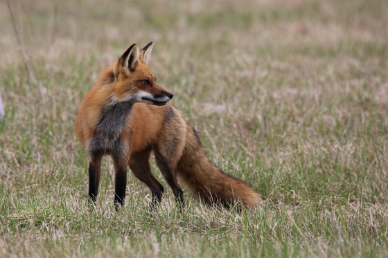 This female fox was teaching her pup to cross the road in a busy part of town. She would bring her pup to the roadside and then run across. The pup would turn around and go back into the bush. The mother did this several times. In this photo she has crossed the road and is waiting for her pup to follow
