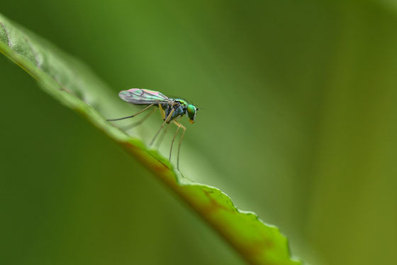 This long-legged fly is photographed on the edge of a leaf.