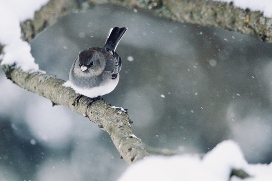 This grumpy looking Junco was perched on a branch of a Pine tree in our yard. It was a really snowy afternoon.