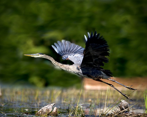 Great blue heron taking off to a new fishing hole he was quite successful but the picture was a long ways away looked like a small bass