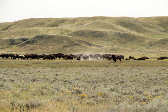 While driving through Grasslands National Park in search of wildlife we found one of the wild bison herds grazing and resting. A lone coyote seemed out of place among the herd.