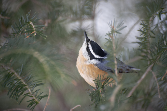 A red-breasted nuthatch in a pine tree.