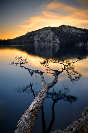 A twisted pine tree clinging to the side of a rock.