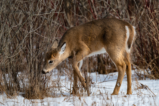 I encounter this deer while walking on a trail. We both look at each other for a little while. Once he figure out I am of no harm to him, he resume his feeding activity and ignore me.