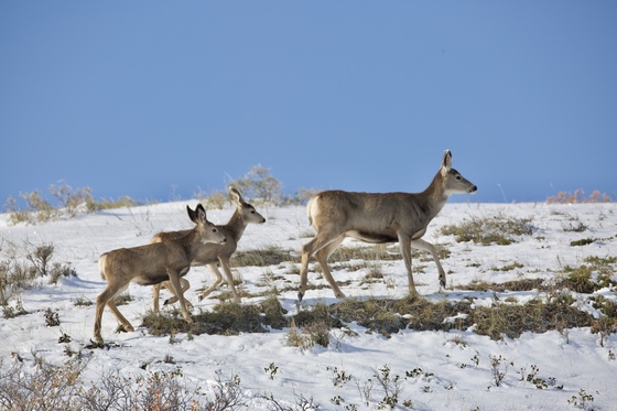 Mule Deer Doe and her fawns on the move after a fresh snowfall. October 1st, 2019