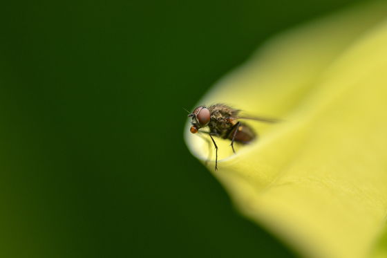 I noticed this fly as it poked its head out from the end of a curled Hosta leaf. It stands out nicely against the yellowish hue of the new leaf and the dark background.
