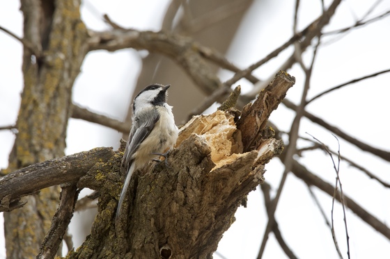 This chickadee seemed very pleased with its find in this old tree stump. It was pecking away at it and pieces of the old stump were flying everywhere.
