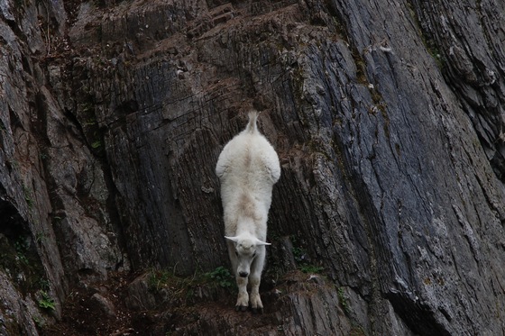 A Mountain Goat kid jumps down from a rock face not missing a beat.