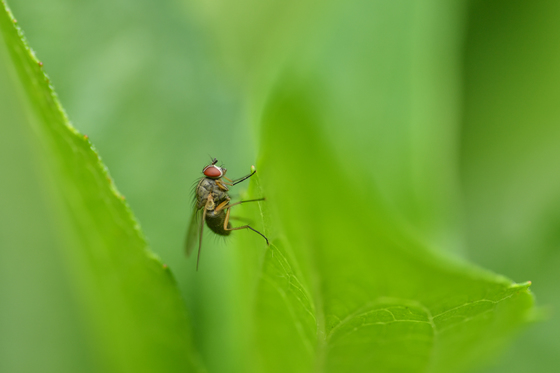 A fly rests on the tip of a leaf and stands out against the bright green surrounding it.