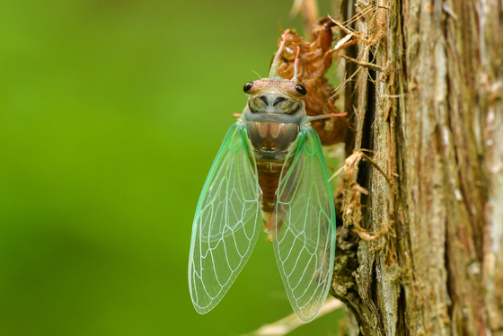 A Cicada that recently emerged as an adult, pumps fluid into its wings and lets them dry a bit before taking off and joining the cacophony of cicada calls.