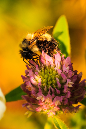 bee collects pollen from clover