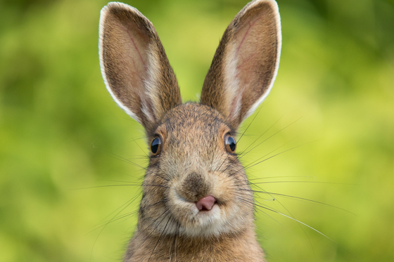 Photo session with the snowshoe hare on the edge of the forest. I was lying on the ground, and this hare fed for an hour in front of me, getting used to my presence.