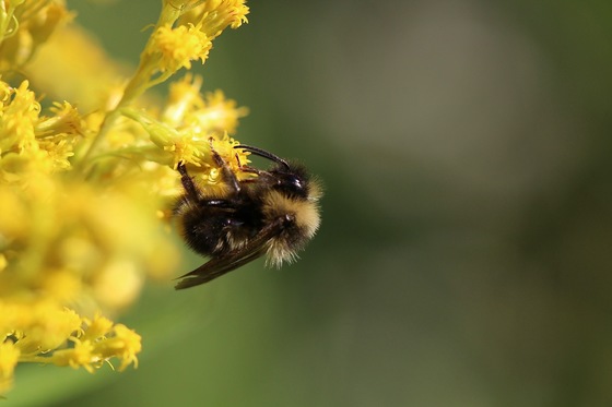 This bubble bee all with about two hundred others were on a patch of golden rod flowers gathering food late in the summer.