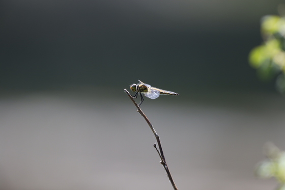 A Dragon fly lands on a lone branch of a shrub bush, like it was overlooking a small pond in search of perhaps a mate or just enjoying the sun.