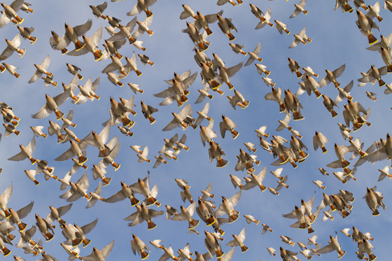 A bunch of about 3500 bohemian waxwing were feeding in the ashes in the little town of Matane during the month of december. Sometimes, they were taking off the all bunch and that was like an explosion of colors in the sky.