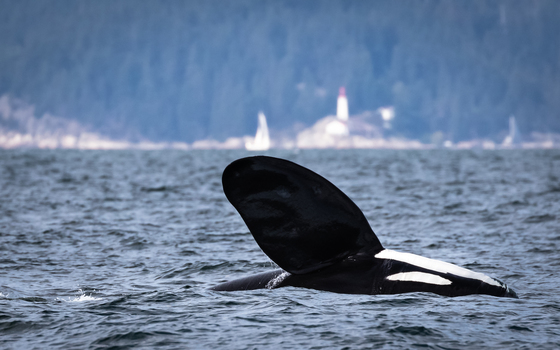 A male transient orca T123A Stanley is celebrating after a seal hunt with his family