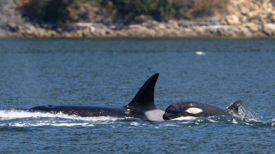 Nothing makes you feel more secure than staying beside your mom. This baby orca feels the same! The white spots on its head are normal because its skin is stiffening.