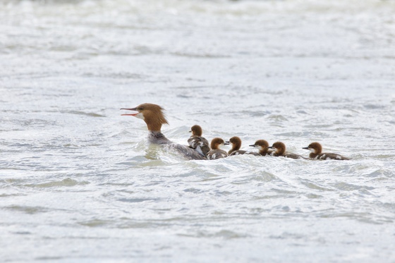 This female merganser and her babies looked like they were on a roller coaster ride on the Old Man river, Lethbridge, June 9th, 2019.