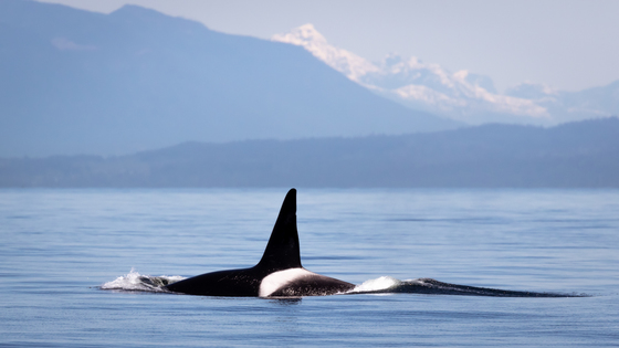 This is typical British Columbia. A spirit animal killer whale is swimming in front of a spectacular snow mountain!