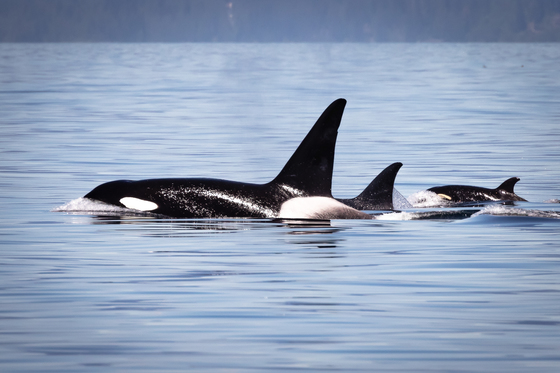 An orca family is travelling in calm water. This is a wonderful photo to show different sizes of dorsal fins: male, female and calf.