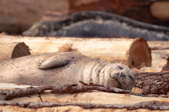 A harbor seal is taking a good nap on log booms. Look at that cute little flippers!