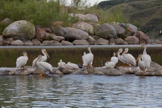 Pelicans congregate near the weir (best fishing place) on the Old Man river, Lethbridge, Alberta, July 3rd, 2019.