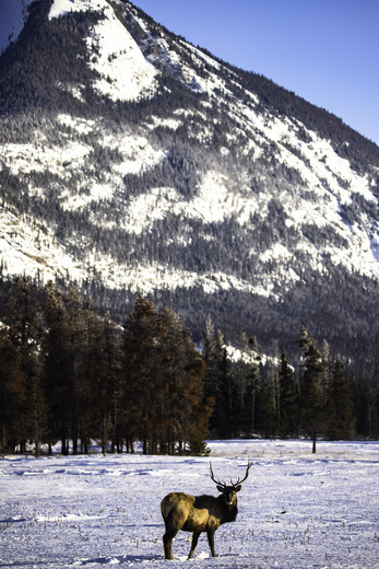 During a cold spell in Jasper National Park an elk takes in their surroundings.