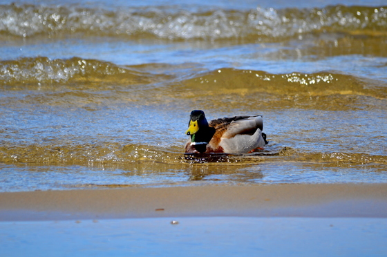 Enjoying some high winds and sunny skies, this Mallard Drake rides the surf on Okanagan Lake.