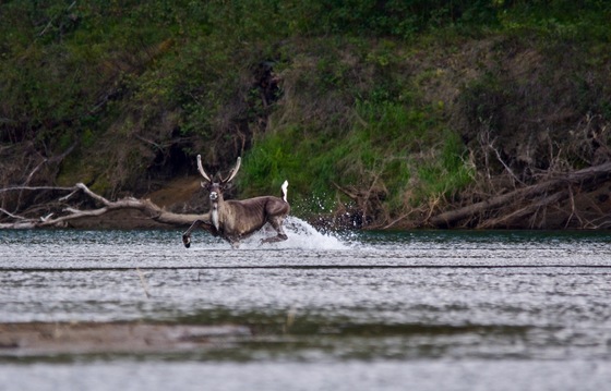 A woodlands caribou crosses the Dease River just ahead of my canoe.