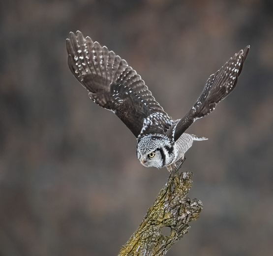A northern hawk owl is taking off from a perch towards a vole hiding in the field.