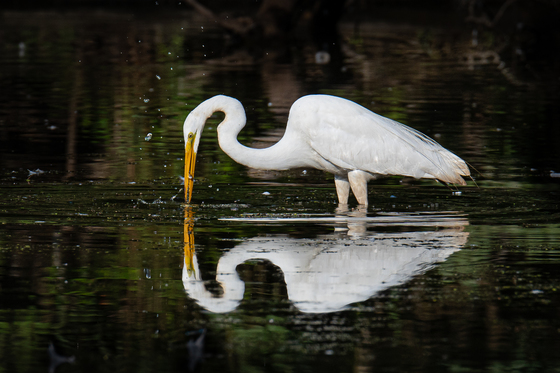 A great egret is catching a fish out of the water in High Park.