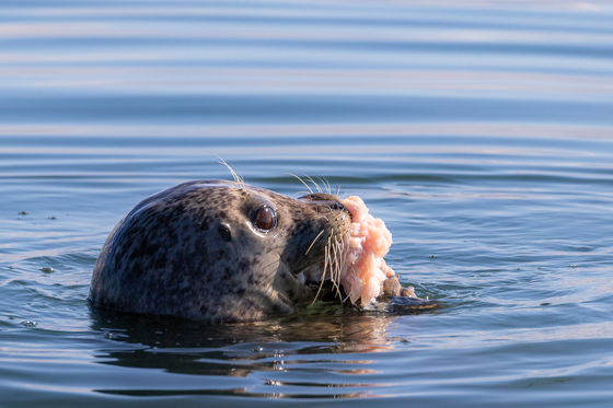 A harbor seal is holding some salmon in its mouth. It needs some time to enjoy its food while not being disturbed by the gulls. This photo was taken on October 2019.