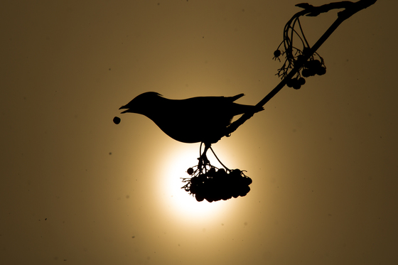 Late afternoon, a waxwing was feeding when the sun came through a snowfall.