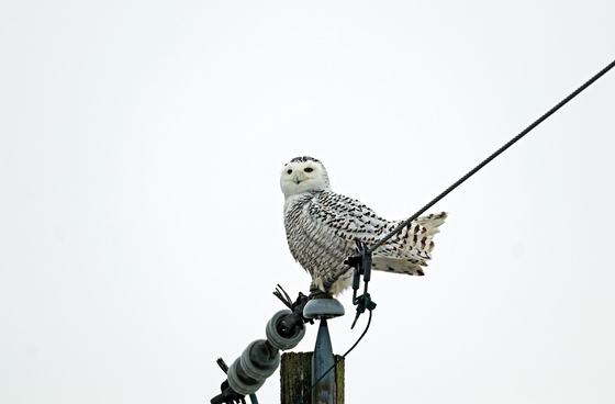 I had heard through the grapevine that a Snowy Owl was spotted in an area basically around the corner from my house so as soon as I could, I was out there searching. I didn't have to search for long as the female Snowy Owl was roosting on a telephone pole right along the road on the outskirts of Guelph Ontario Canada. I watched her for a couple hours but she was quite content to just sit. Her head was constantly on a swivel searching the fields and every once in a while she would make a few moves or shift position or make funny faces or just look at me. In this image, you can see that she is agitated by her posture. As it happens, there were a few others who noticed her on the pole and got a little too close for her comfort. She did not leave her perch but she let them know that she was not happy. The Snowy Owl is a sit and wait hunter. Silent and patient it surveys the winter fields as it hunts during the day, unlike other Owls.