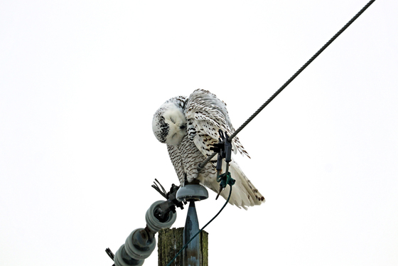 I had heard through the grapevine that a Snowy Owl was spotted in an area basically around the corner from my house so as soon as I could, I was out there searching. I didn't have to search for long as the female Snowy Owl was roosting on a telephone pole right along the road on the outskirts of Guelph Ontario Canada. I watched her for a couple hours but she was quite content to just sit. Her head was constantly on a swivel searching the fields and every once in a while she would make a few moves or shift position or make funny faces or just look at me.The Snowy Owl is a sit and wait hunter. Silent and patient it surveys the winter fields as it hunts during the day, unlike other Owls.