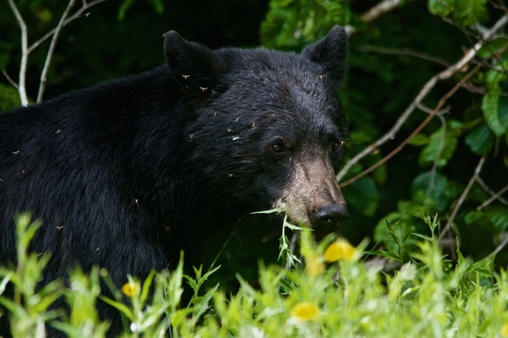 This black bear is oblivious to his swarming "friends" as he/she chows down.