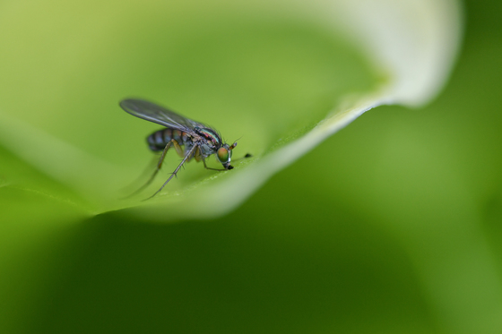 A Long-Legged Fly drinks the dew from a leaf in the early morning.