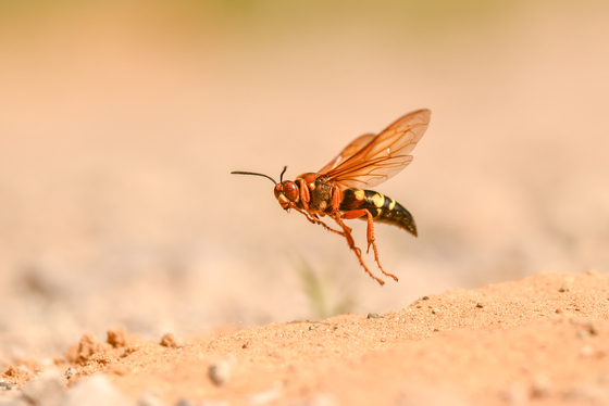 A Cicada Killer does a quick check of its various nests before taking off to find another cicada. As it flew by me, it almost looked like it turned towards me to confirm that I wasn't a threat.
