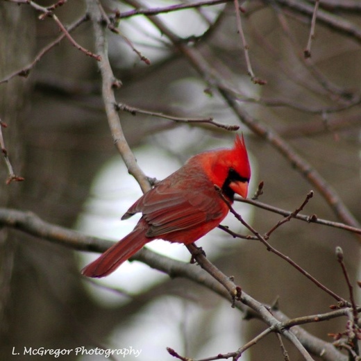 I captured this Cardinal sitting up in a tree during winter in London, Ontario.