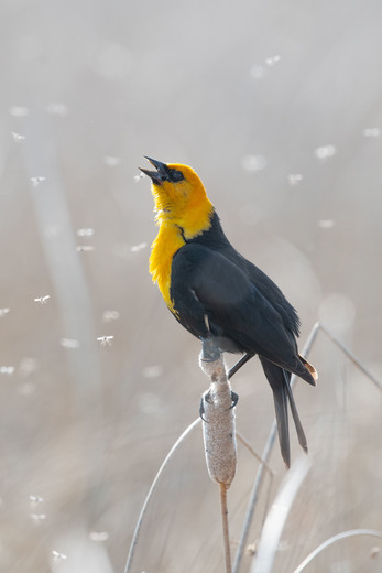 Yellow-Headed Black Bird singing his heart out amidst a swarm of hundreds of midges