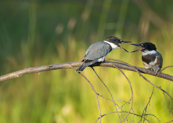 A pair of juvenile belted kingfishers squabble over a perch as they wait for Mom to come back with dinner.