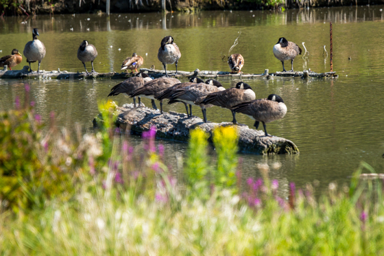 A gaggle of Canada Geese napping on a log.