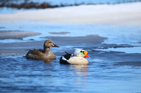 A King Eider hen and drake take a quiet, afternoon swim in the Queen Maud Gulf Migratory Bird Sanctuary, Nunavut.