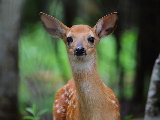 A very young (1-2 months) white-tailed deer fawn approaching me to innocently investigate a new sight in the woods.
